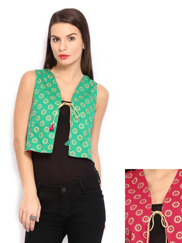 Anouk Rustic Women Green & Pink Printed Sleeveless Reversible Waistcoat
