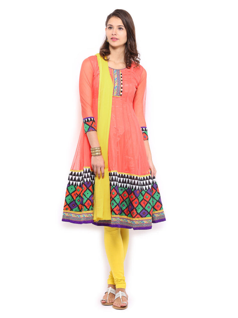 Anouk Women Coral Pink & Yellow Anarkali Churidar Kurta with Dupatta